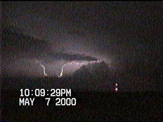 The storms merged into a MCS after dark, so we pulled over south of McCook NE to get photos and video of the lightning. Most of the lightning was of the in-cloud variety, which occasionally backlit this updraft tower. |